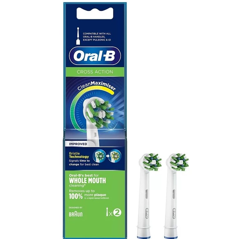 Az Oral-B továbbfejlesztett CrossAction kefefejei CleanMaximiser technológiát tartalmaznak, amely a zöld szálakat sárgára színezi, így segítve az optimális kefefej teljesítményt és a legjobb tisztítást.